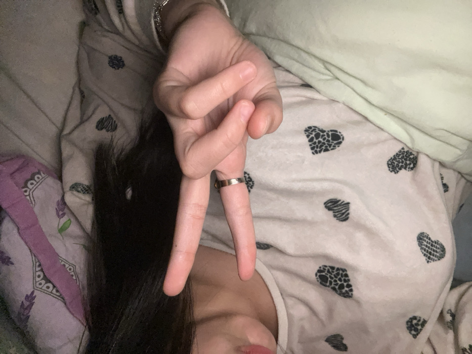 An overhead shot reveals a person reclining in bed. A hand with a plain ring on one finger makes a "V" sign. Some black hair is visible below the hand. The person is wearing a pajama top with heart patterns. The bedding includes a pillow with a patterned case and a solid-colored blanket.