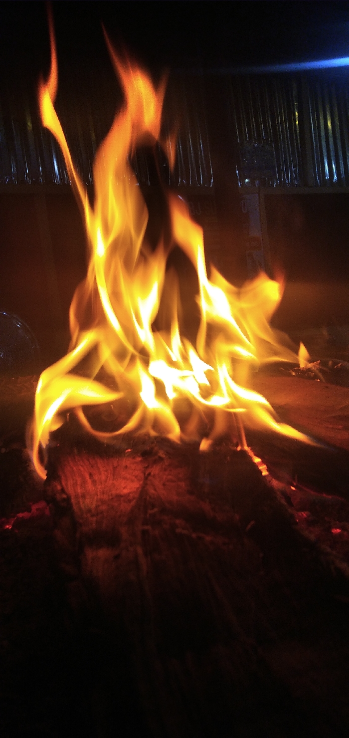 A vibrant campfire dominates the frame, its flames dancing in shades of yellow and orange. The fire engulfs dark logs, their glowing embers visible beneath the blaze. A corrugated metal surface is subtly visible in the background, adding a hint of an enclosed space to the scene. The lighting is warm and dramatic, emphasizing the intensity of the fire.