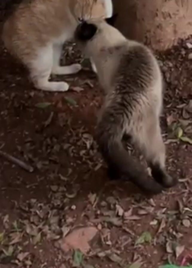 Two cats interact outdoors in a yard. One is an orange cat, while the other is a Siamese cat. The orange cat is standing while the Siamese cat rubs its head against the orange cat. The ground is a mix of dirt and scattered leaves, with a tree trunk visible in the background.