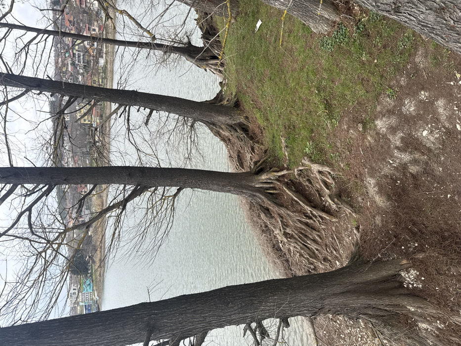 The scene depicts an outdoor landscape in Nikolovo, Bulgaria, observed from an elevated position under an overcast sky. In the foreground, several mature, bare deciduous trees with robust, exposed root systems anchor themselves to a steep, vegetated embankment comprising sparse green grass, exposed soil, and fallen brown organic matter. This embankment slopes directly into a placid, grey-green body of water that fills the midground. Across the water, on a distant hillside, a compact residential area is visible, featuring numerous houses with various colored facades and pitched roofs. No human subjects or active events are present within the frame.