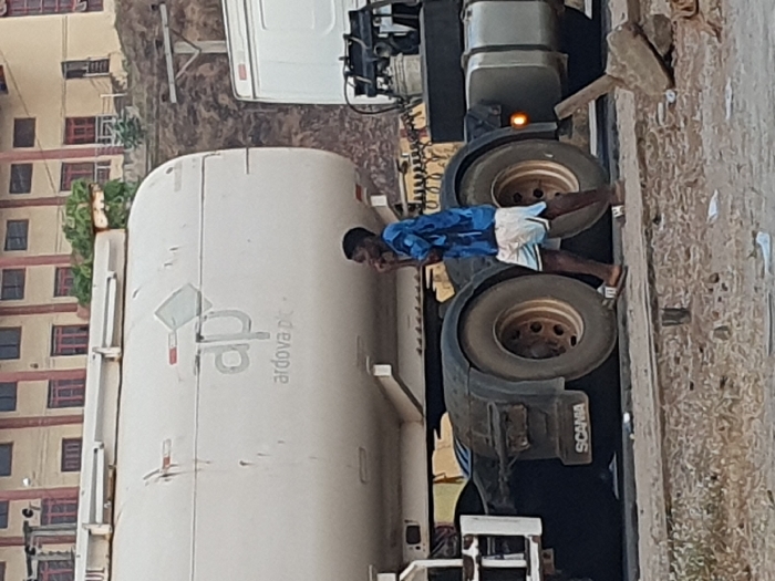 A man in blue and white clothing lies between the wheels of a Scania tanker truck