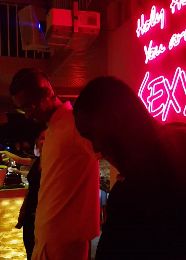 A person wearing a light-colored shirt is visible against a background with a red neon sign that reads "Holy shit you are SEXY". The lighting in the room is predominantly red. Another person in dark clothing stands behind the first, partially obscuring the view. An electronic device with a blue light and a corrugated wall are also visible.