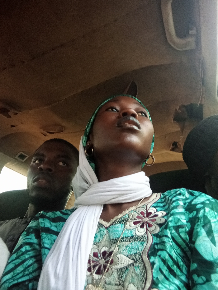 A young woman in a green patterned top, white scarf, and gold hoop earrings looks upward, possibly out a vehicle window. A man with dark skin and short hair is partially visible to her left, also looking toward the same direction. A portion of another individual is seen to her right. The interior of what appears to be a vehicle, marked with a worn roof and interior features, frames the subjects.