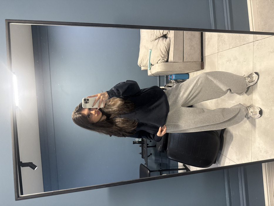 A full-body mirror reflection of a female subject is central to the image, depicting an interior room in Yerevan, Armenia. The female subject has long, dark brown hair and is dressed in a dark, possibly navy, oversized hoodie, light grey wide-leg sweatpants, and light-colored athletic sneakers with dark accents. She holds a light-colored smartphone in her raised right hand, displaying long, light-painted fingernails, actively capturing her reflection. Her facial expression is a subtle pout. The room features solid medium-blue painted walls and light-colored, large format floor tiles. Reflected behind the subject, to the viewer's left, is a black hydraulic chair adjacent to a small black table holding dark objects. A black ceiling-mounted track light with one active spotlight is visible above this area. To the viewer's right, a light grey upholstered armchair, with a cushion and a light-colored item on it, stands beside a vertical blue cylindrical object on the floor. No other individuals are visible.