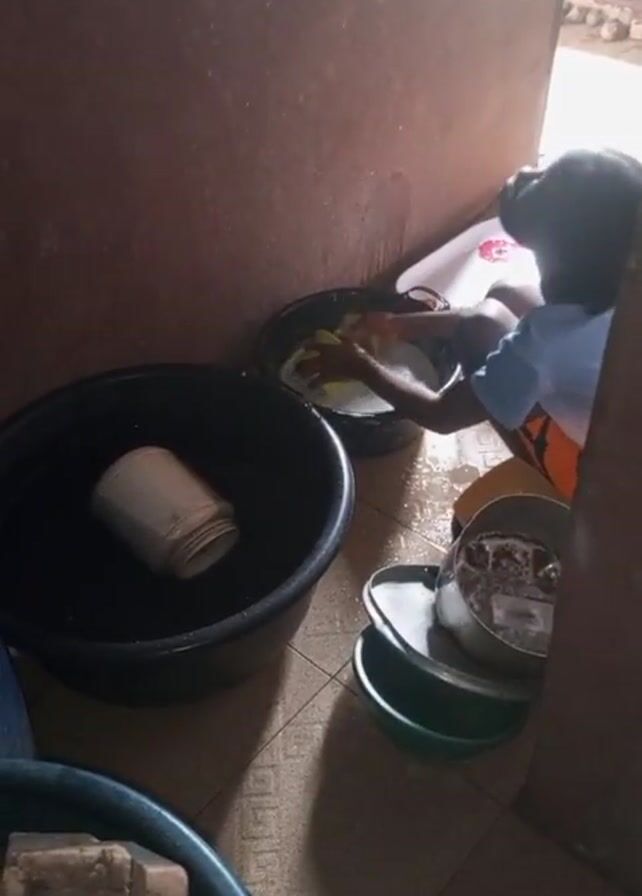 A person with dark hair is kneeling and washing dishes in a black tub. The person is wearing a light blue shirt. To the left of the person is another black tub with a white jar inside. Below the tub are other various bowls and pans. The scene is indoors, with tile flooring and a brown wall on the left and right. The light source appears to be coming from behind the person.