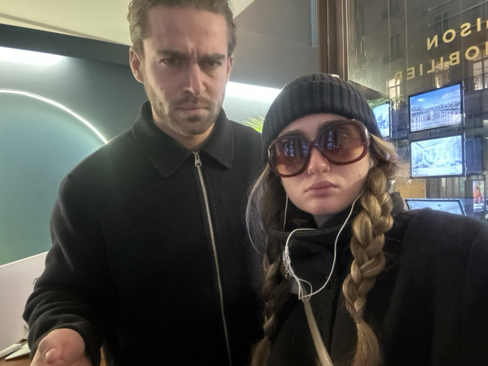 Two people are posing indoors. A man with short, dark hair and a stern expression stands on the left, wearing a dark jacket. To his right is a woman with blonde braided hair and large sunglasses, wearing a black beanie and a black sweater with earphones. In the background, reflections of buildings and screens displaying real estate images are visible in a window. The lighting is somewhat dim, giving the image a casual feel.