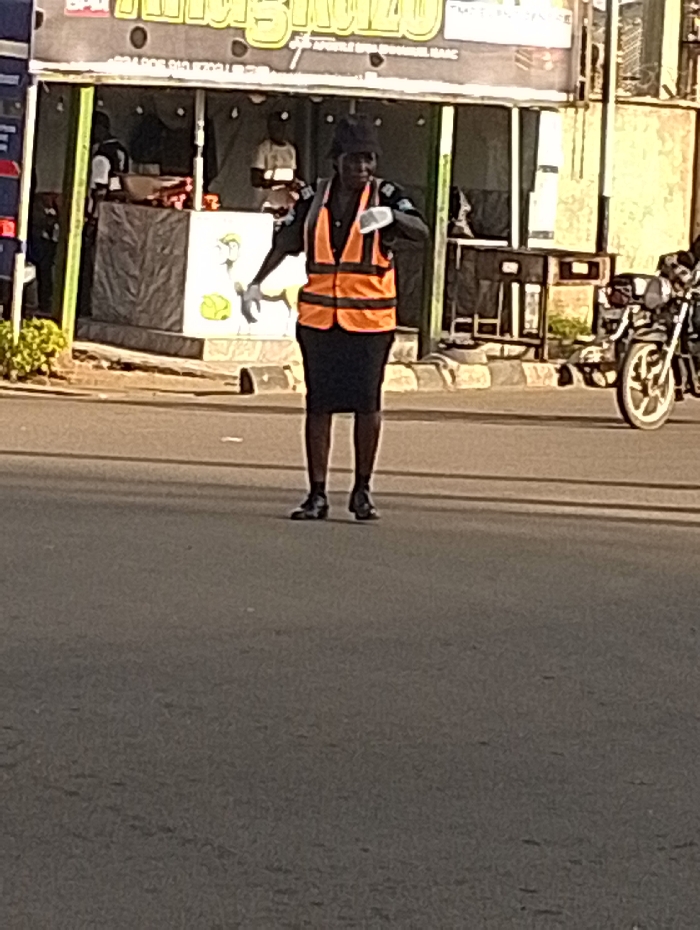 The image depicts an outdoor urban scene in Barden Yana, Nigeria. A female individual stands centrally on an asphalt road. She wears a dark uniform shirt, a knee-length dark skirt, dark shoes, a dark brimmed hat, and light-colored gloves. An orange reflective safety vest with two horizontal reflective strips is worn over her uniform. Her left arm is extended forward and slightly to the side, while her right arm is bent at the elbow with the hand raised near her chest, indicating a gesture of direction. In the background, an elevated concrete pavement features a commercial establishment under a canopy. A large yellow sign with dark lettering, partially legible as "MAGAZINO," is mounted above the canopy. Beneath the canopy, two males are discernible; one is partially obscured by a dark-tarped structure on the left, and another stands behind a counter on the right. A white panel with indistinct graphics is visible between these elements. To the right, a dark motorcycle with a chrome wheel is parked on the elevated area. Concrete curbs delineate the road from the background structures. The scene is illuminated by natural daylight.