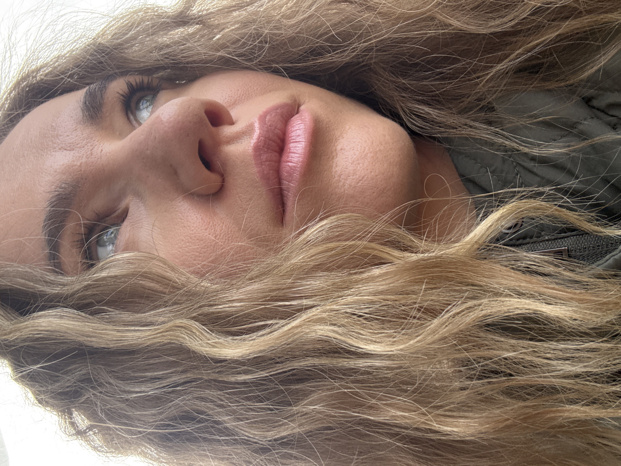 A close-up, tilted view of a woman's face framed by light brown, curly hair