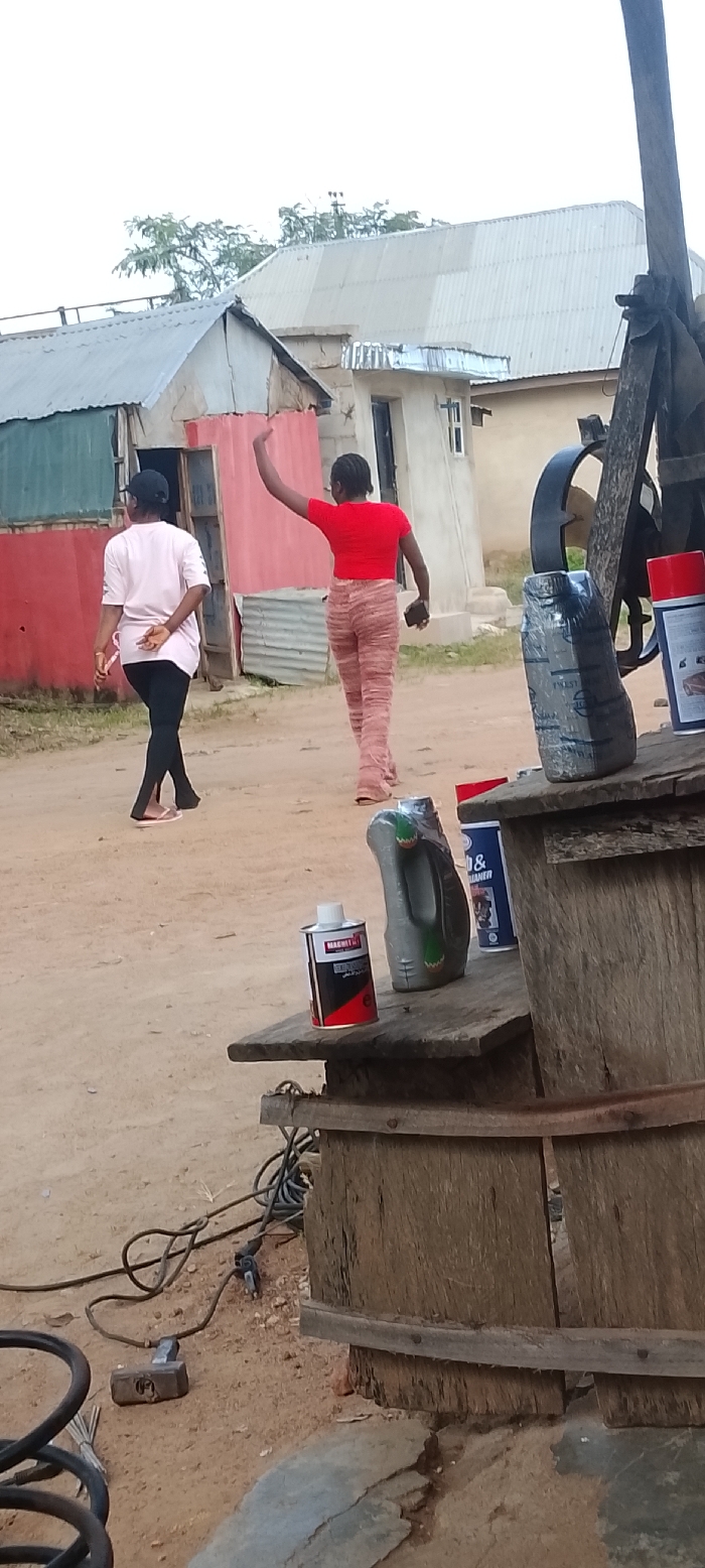 The image depicts an outdoor scene in Adankolo, Nigeria, featuring two individuals walking away from the camera on an unpaved dirt path. The individual on the left wears a light pink short-sleeved top, black leggings, and sandals, with a dark cap. Her hands are clasped behind her back. The individual on the right wears a red short-sleeved top and patterned light brown trousers. Her right arm is raised in a gesture, possibly a wave, and she holds a dark object in her left hand. In the foreground on the right, a wooden structure, possibly a table or stand, holds several items: a grey plastic container, a red and black can labeled "MAGMA," a blue can labeled "D & POWER," and a red spray can. Black coiled cables and a sledgehammer connected to a cable are visible on the ground in the lower-left and near the wooden structure. The background features several simple residential structures with corrugated metal roofs; one building has red-painted walls and green metal siding, while another is light-colored concrete. Trees are visible above the rooflines under a clear, bright sky.