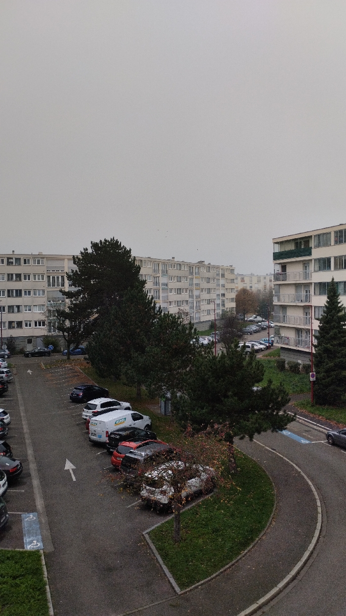 The image depicts an urban residential scene in Schiltigheim, France, under an overcast, light grey sky. The foreground and midground consist of asphalt parking lots and access roads, bordered by sections of grass and trees. To the left, a long, multi-story apartment building with light-colored facades, numerous windows, and integrated balconies extends horizontally. Another multi-story apartment building, similarly light-colored with multiple balconies (some featuring green railings), is situated prominently on the right side of the frame. Additional apartment buildings are visible in the background, partially obscured by trees. The parking areas contain numerous parked vehicles of various colors and types, including sedans, SUVs, and a white commercial van with "BOZEL" visible on its side. A white arrow is painted on the asphalt of the main parking lane in the foreground. Blue handicapped parking space markings are visible on the asphalt in two distinct locations. The scene is heavily populated with vegetation, including several tall, dark green conifer trees (likely pines) and numerous deciduous trees. Some deciduous trees exhibit sparse autumnal foliage with red-brown leaves, while others appear largely bare. Grassy areas are present between the paved surfaces and along building perimeters. Street furniture includes a blue circular sign on the left, a red square sign on the right, and utility poles. No individuals are visible.