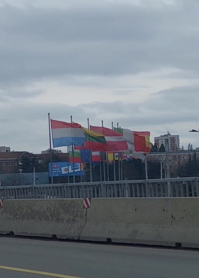 The video captures a row of various national flags waving in the wind against an overcast sky. The flags are mounted along a roadside barrier, with buildings visible in the background. The perspective suggests the video was taken from a moving vehicle on a road separated by the barrier. The flags of Luxembourg, Lithuania, Latvia, Italy, Bulgaria, the European Union, Austria, Belgium, Germany, and Greece can be identified. A billboard is also visible with a slogan written on it.