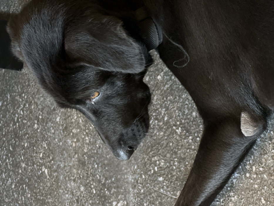 - "A black Labrador Retriever rests on a gray floor" by FM-37mOy1, licensed under CC BY 4.0