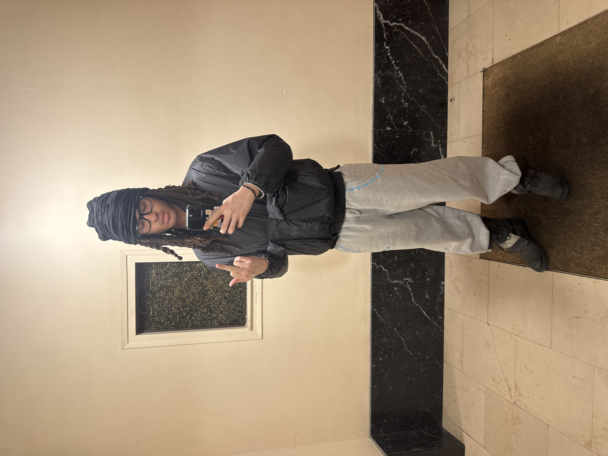 A person stands inside a building with beige walls and tiled floors, taking a selfie with a smartphone. They are wearing a black beanie, glasses, a black jacket, grey sweatpants, and black shoes. The person is holding up two fingers. A window with a textured screen is visible on the wall. The floor is comprised of beige tiles interspersed with a strip of black marble and a dark-colored doormat. The location is unspecified and there's no explicit indicator of Paris, France.
