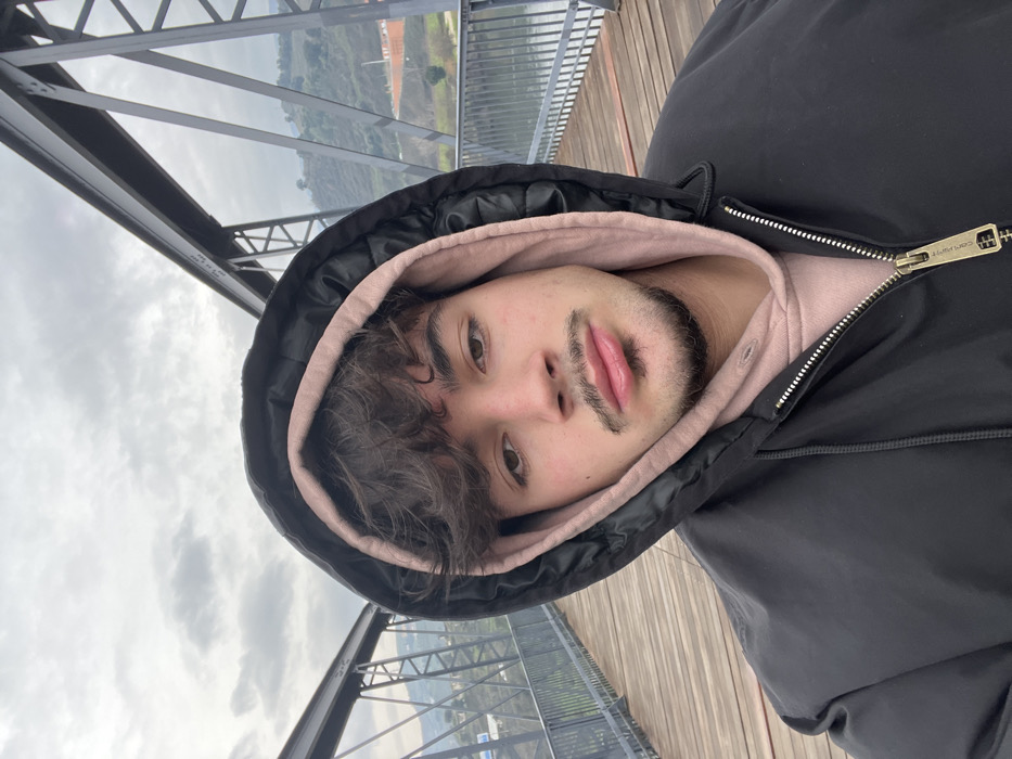 A young male is depicted in a close-up, head-and-shoulders portrait, positioned centrally and looking directly at the camera. He has dark, curly hair, a light brown mustache, and a short chin beard/goatee. His lips are slightly parted. He wears a black hooded puffer jacket with the hood up, layered over a light pink hooded sweatshirt, also with its hood up. The gold-colored zipper of the black jacket is partially visible, featuring a Carhartt WIP logo on the pull. The scene is set on the wooden deck of a metal truss bridge, identified as the Ponte Pedonal de Peso da Régua, in Peso da Régua, Portugal. The bridge's grey metal superstructure is visible overhead and to the sides. In the background, green, terraced hillsides and the Douro River are visible under an overcast sky.