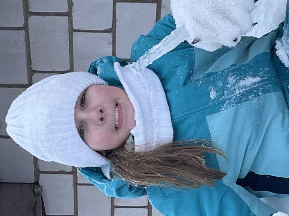 The scene depicts a young female child outdoors in a snowy environment in the city of Italmas, Russia