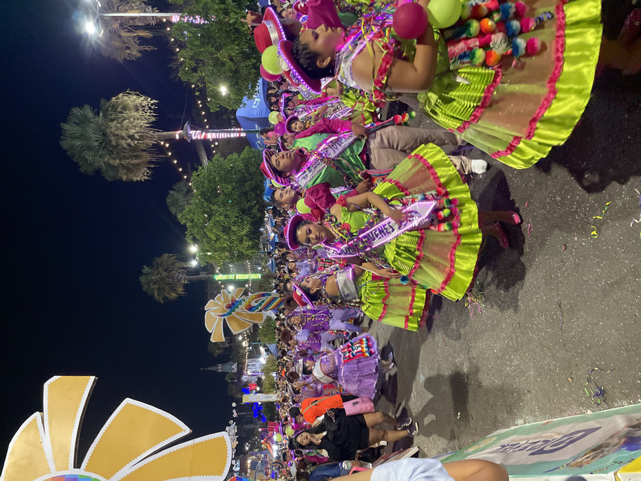 A vibrant street parade at night showcases a line of young individuals adorned in colorful traditional attire. They sport hats, skirts with frills, and sashes marked "JUVENES". Above, palm trees and string lights illuminate the scene. The foreground includes a large yellow flower decoration, and confetti litters the street. The crowd watches the parade, adding to the lively atmosphere.