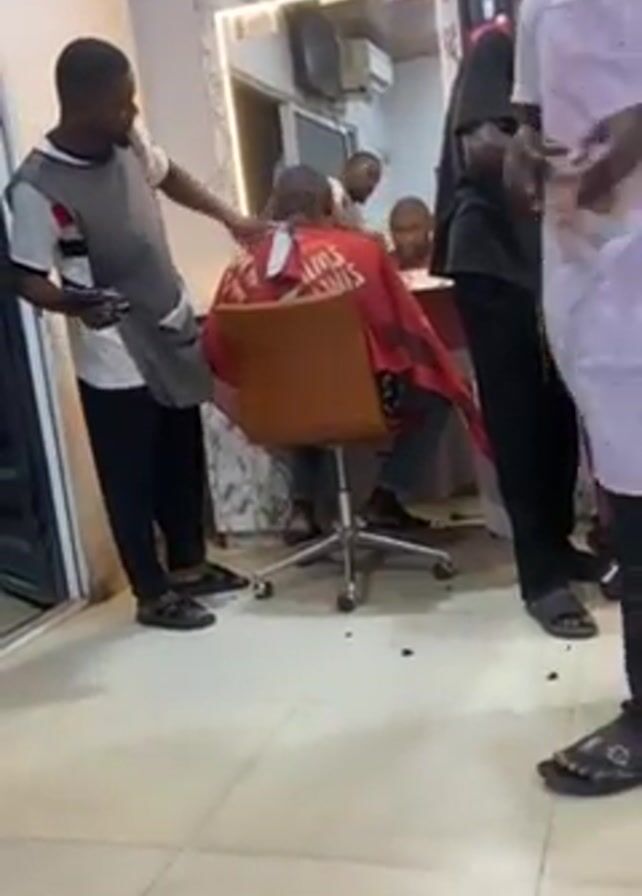 interior of a busy barbershop. Four barbers are visible, each attending to a customer in a barber chair. The barbers are all dressed casually in clothes such as t-shirts, trousers, and vests. Some wear aprons. They are using electric clippers to cut the hair of their customers, who are seated with barber capes on. The shop has mirrors on the walls, showing reflections of the activity within. The floor is tiled and a sign reading "OPAY" is visible. The barbers are moving around and interacting with their clients.