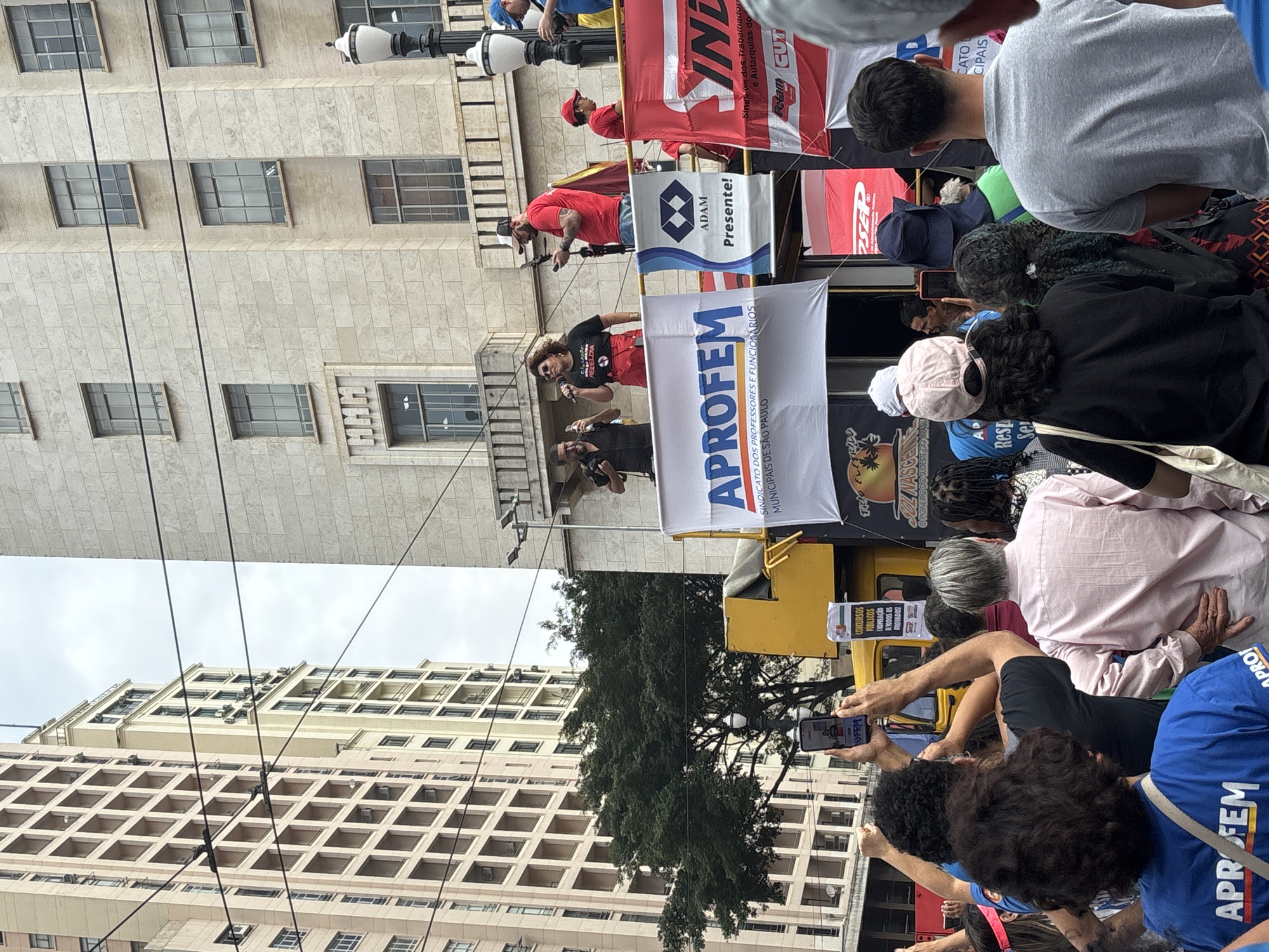 Here's a detailed description of the image: **Scene:** A political rally or protest in what appears to be a city center, likely São Paulo, Brazil. **People:** A diverse crowd of people is present, including speakers on a makeshift stage, protesters, and observers. Many individuals are holding up phones to record the event. **Subjects:** The focus is on a group of speakers on a yellow flatbed truck that serves as a stage. Banners and flags are displayed, including one from "APROFEM" (Sindicato dos Professores e Funcionários Municipais de São Paulo), indicating involvement of teachers and municipal workers of São Paulo. **Objects:** Several banners and flags with political or union-related slogans. One banner reads "ADAM Presente!" and another with the acronym "IND". Visible are buildings typical of a major city center. **Actions:** People are listening to the speakers, recording with their phones, and seemingly chanting or raising their fists. The speakers are actively addressing the crowd. **Interactions:** The speakers are the center of attention, engaging with the crowd, while the crowd interacts with the speakers and each other through cheers, recording, and visual displays. **Environment:** The scene is set in a busy urban location with tall buildings as a backdrop. The sky is overcast, suggesting either an early or late time of day, or simply a cloudy day.