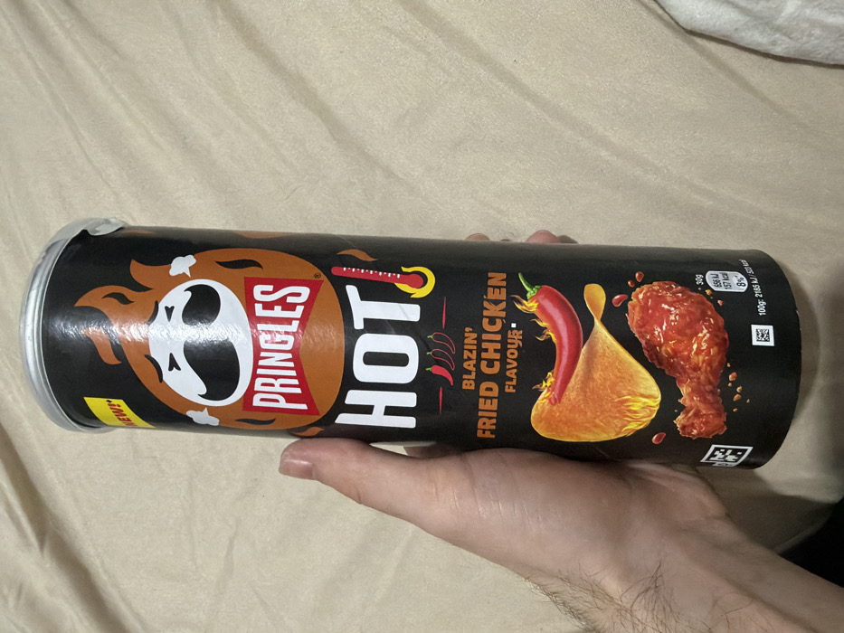 - "A Pringles "HOT! Blazin' Fried Chicken Flavour" can, cylindrical and predominantly black with orange, red, and white graphics, is held vertically by a human hand" by FM-k3pYj2, licensed under CC BY 4.0