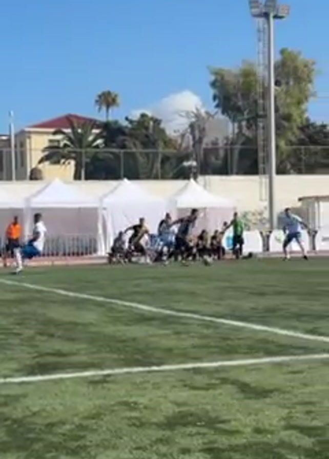 soccer match in progress. The action is taking place on a green field under a blue sky. A few white tents are pitched to one side of the field. Players in black and yellow uniforms and in white and blue uniforms are seen kicking and running after the soccer ball. Some buildings and trees can be seen in the background.