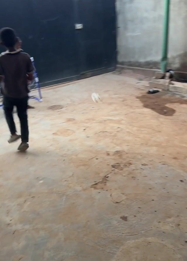 A video shows two young boys playing soccer in what appears to be a fenced-in yard or patio area with a rough, concrete-like surface