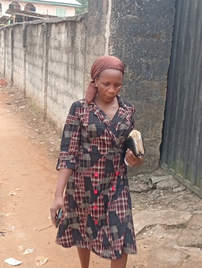An adult female is depicted walking outdoors in Aba, Nigeria, positioned slightly right of the frame's center with her gaze directed downwards