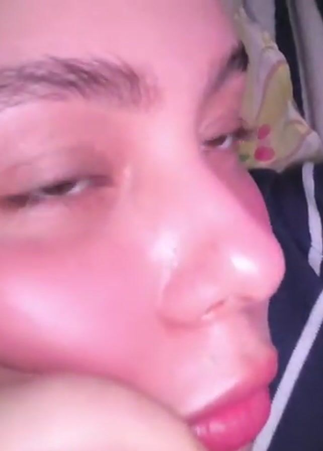 close-up of a person's face. The person has pinkish skin and brown eyes. They are wearing lipstick and a dark blue shirt with white stripes. The person's face is resting on their hand, and they appear to be looking off to the side. The background includes bedding and clothes.