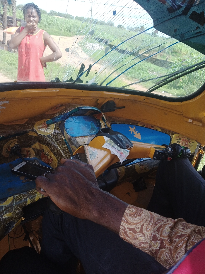 The image depicts a scene from the interior of a yellow, three-wheeled vehicle, likely a Keke Napep, looking out through a severely scratched and cracked windshield