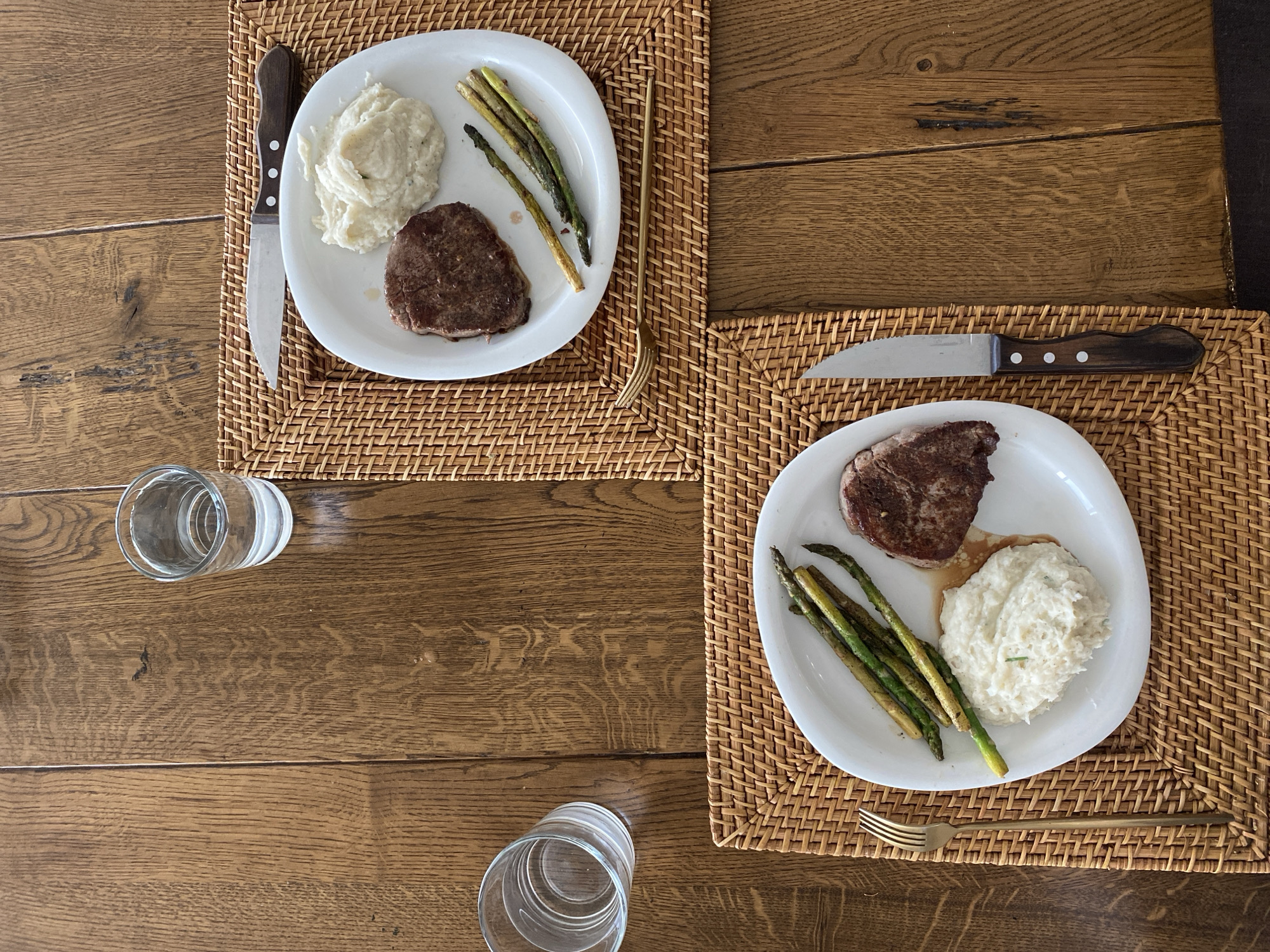 - "A top-down, eye-level shot shows two plates of food, each with a piece of steak, mashed potatoes, and asparagus, placed on woven placemats on a wooden table" by FM-068ty1, licensed under CC BY 4.0