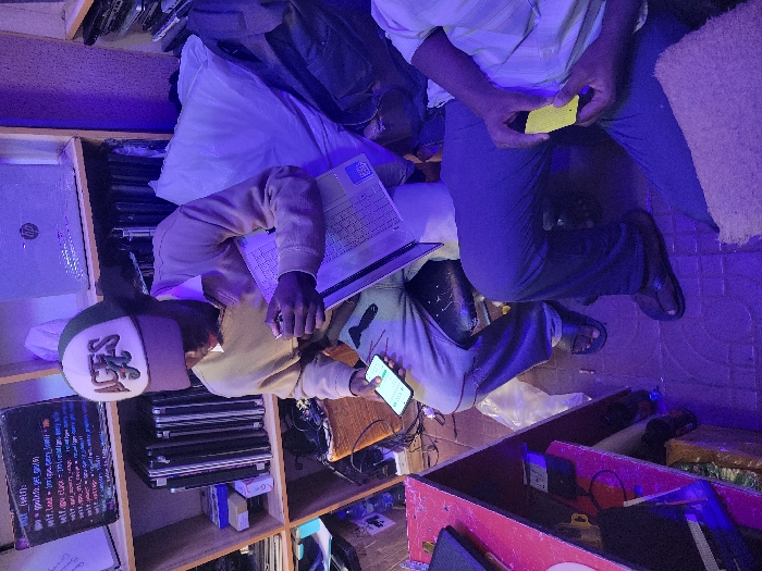 A person sits cross-legged on the floor, holding a laptop and a mobile phone. A second person sits nearby holding a yellow card. Shelves filled with laptops are visible behind the seated figure. A whiteboard displays lines of code. The scene is lit with a strong blue light. Other objects clutter the floor and shelves, including bags, boxes, and electrical cords.