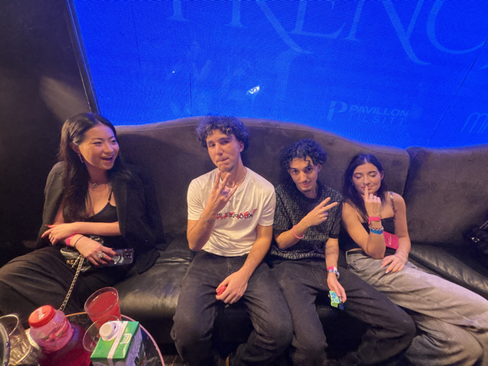 Four young adults are casually posed on a dark brown couch. The two on the left are female, with long, dark hair. The two on the right are male, both with curly hair. Two are making hand gestures: one with a "W," and the other with a peace sign. A low table in front of one woman holds a pink drink and a green box. A blue screen with white lettering forms the background.