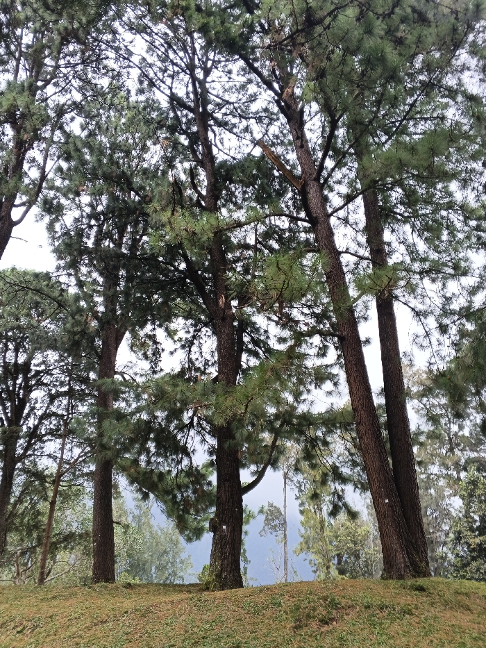 A cluster of pine trees dominates the scene, their dark trunks rising from a grassy mound. Branches extend upward, creating a dense canopy of green needles against a pale sky. Mist or fog obscures the background, lending an ethereal quality to the landscape. Hints of other trees and vegetation peek through, adding depth to the hazy vista.