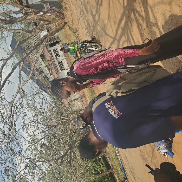 The scene is set on an unpaved, reddish-brown dirt road in Ihiagwa, Nigeria, under a partly cloudy sky