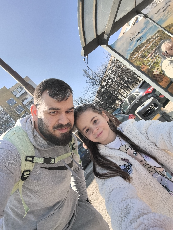 - "A selfie-style photograph captures an adult male and a child female standing outdoors on an urban street in Sofia, Bulgaria, during daytime under a clear blue sky" by FM-P27123, licensed under CC BY 4.0