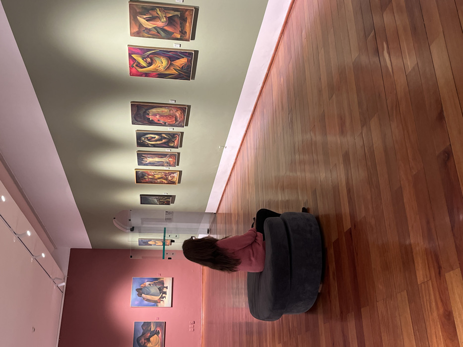 A girl sits on a gray curved bench in an art museum. Her long brown hair hangs down her back, and she wears a pink sweater and black pants. A series of paintings hang on the pale green wall to her left. Two more paintings are visible further down the hall on a pink wall. The floor is made of polished wooden planks. The perspective is slightly skewed, giving a sense of depth and height to the scene.