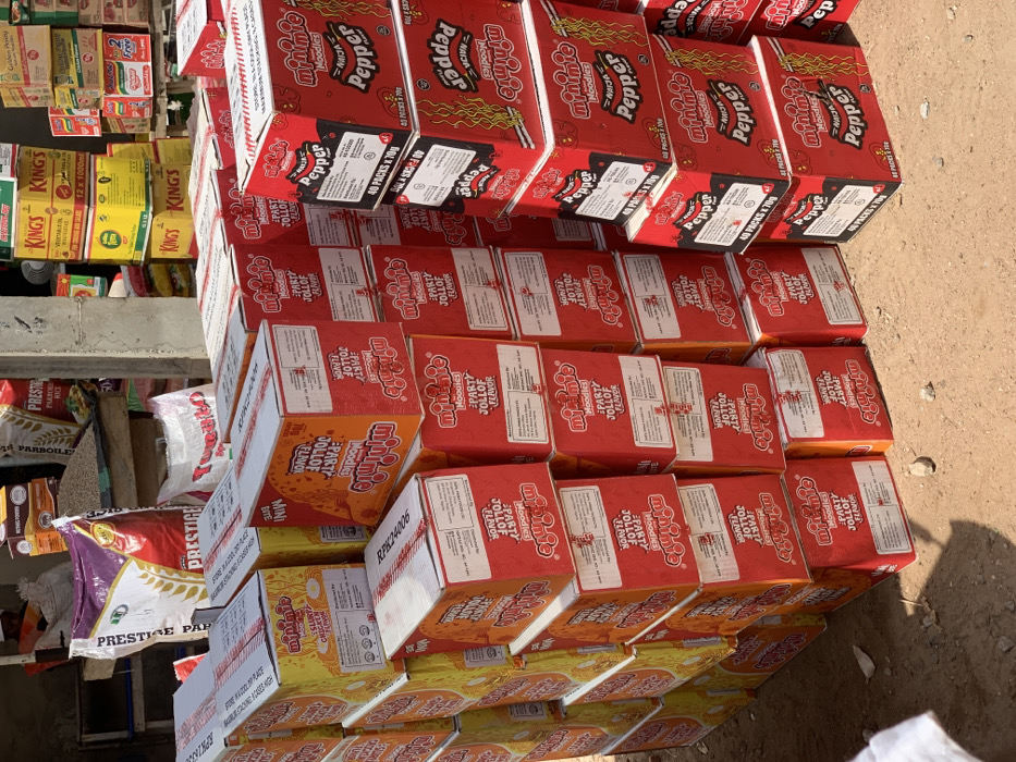 A roadside display of food products shows stacked boxes of "minimie Noodles" in various flavors
