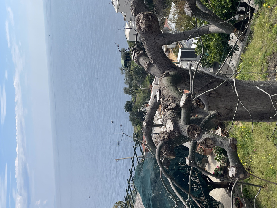 The scene captures an elevated coastal view in Arienzo, Italy, under a partly cloudy sky. In the immediate foreground, a heavily pollarded deciduous tree with thick, gnarled, grey-brown branches occupies the lower central and right portions of the frame. Numerous light-colored, circular cut surfaces on the branches indicate recent pruning. Thin, bare branches extend from the main structure. To the left, a smaller tree or structure is covered by a dark green mesh tarp supported by a metal framework, with several terracotta pots positioned on the green, grassy ground which also features small yellow flowers. A metal barrier or fence is partially visible at the lower right. The midground presents a descending slope revealing parts of a residential area with white-walled buildings, some featuring red-tiled roofs and white railings on balconies or terraces. These structures are interspersed with green and sparse vegetation, including olive trees. A dark, rectangular, vertical panel is affixed to a structure in the mid-right. The background consists of a vast expanse of calm, light blue-grey sea, extending to a distant horizon. Several small boats, appearing as white or dark specks, are sparsely distributed across the water; at least one sailboat with a mast is discernible. The sky above is light blue with scattered white clouds, denser towards the upper left, and a slight atmospheric haze is present near the horizon line over the water. No individuals or direct interactions are visible.