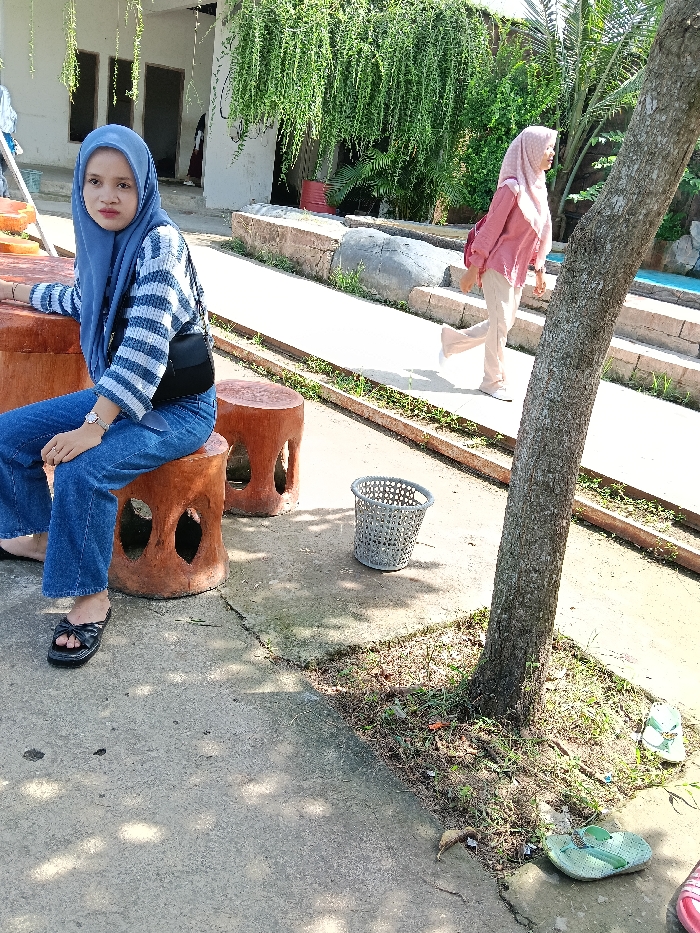 A young woman in a blue hijab and striped shirt sits on a rustic stool, her legs crossed, near another matching stool and a gray waste basket. In the background, another woman in a pink hijab walks along a paved path. A large tree trunk dominates the right side, with sandals lying on the ground near its base. Greenery and building structures complete the scene.