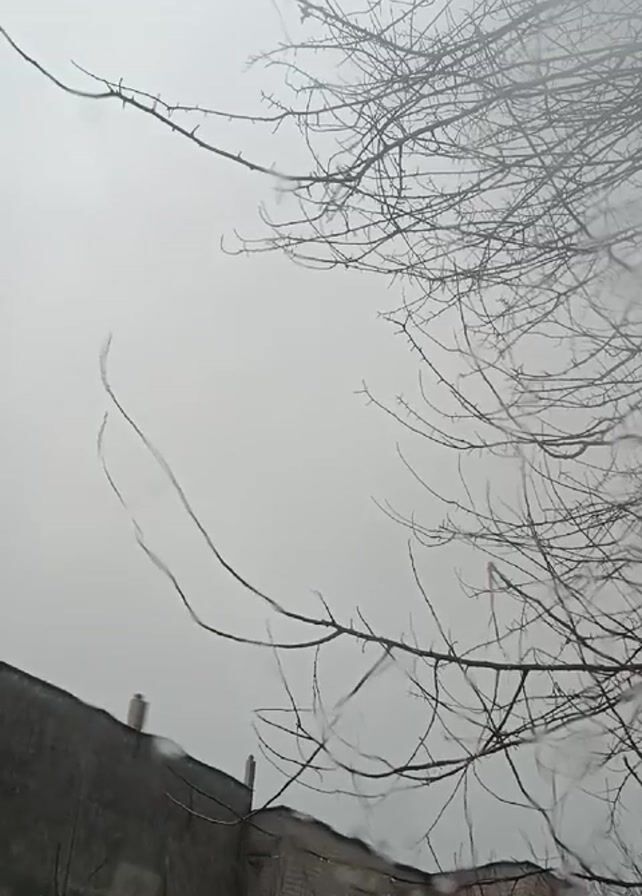 bare tree in the foreground, its branches stark against an overcast sky. Behind the tree, parts of a building are visible. There appears to be rain or snow falling. The scene is still and lacks any human presence or interaction.