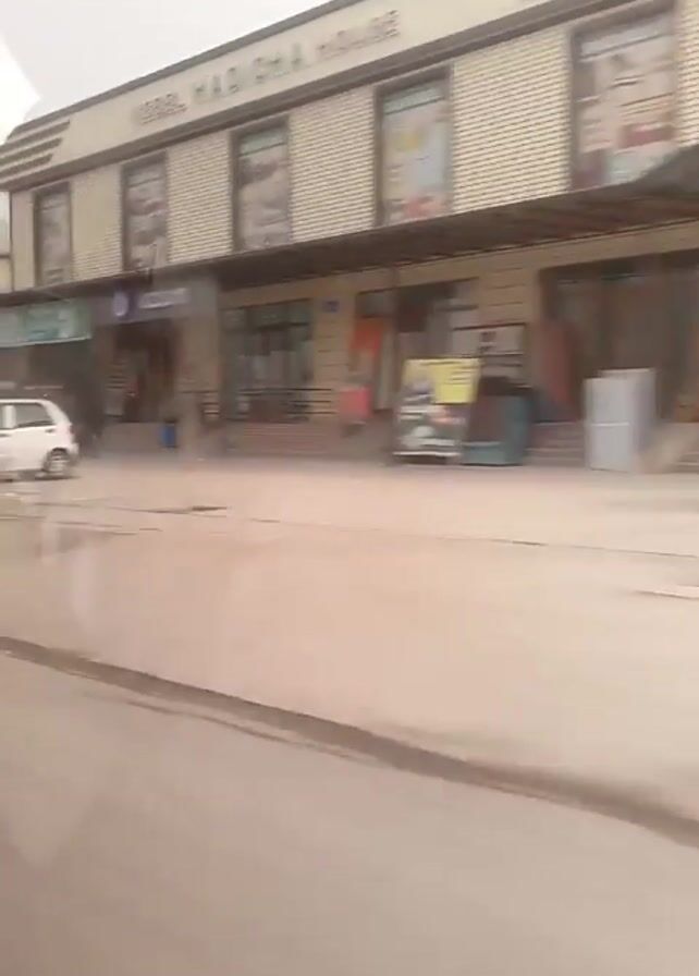 The camera travels down a city street, capturing storefronts and passing vehicles. Buildings are primarily one or two stories tall, with signs in a language other than English. Cars, including a white hatchback, a silver sedan, and a blue van, are seen parked or moving along the street. The environment appears urban, with a cloudy or hazy sky overhead. The video is taken from a moving vehicle, giving a slightly shaky perspective of the scene.