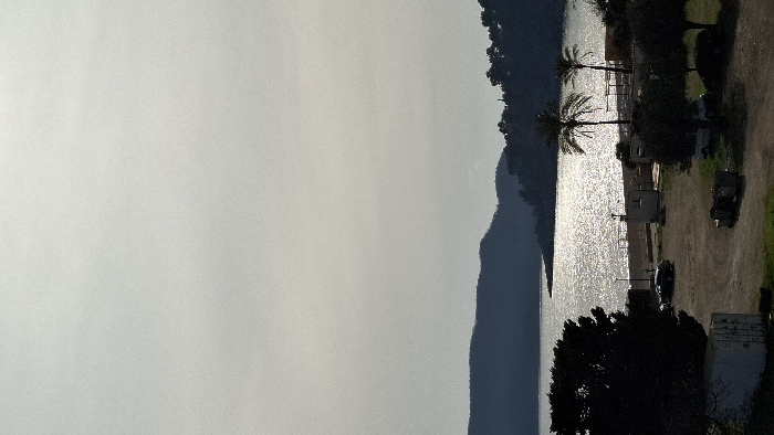 The image presents an elevated view of a coastal area in Boreti, Montenegro. The upper portion of the frame is dominated by a light gray, overcast sky. Below this, a dark, undulating mountain range forms the distant horizon across a body of water. The water surface, likely a bay, exhibits strong specular reflections from sunlight, creating a bright, shimmering path extending from the mid-distance towards the foreground. A distinct headland or point juts into the water on the right side. In the midground, a mostly undeveloped dirt or gravel area is visible, serving as a parking lot. A dark-colored sport utility vehicle (SUV) is parked on the left side of this area. Near the water's edge, several small, white rectangular structures are present, possibly associated with beach services. Behind these structures, a sandy or gravel beach contains multiple stacked or covered pieces of beach furniture, such as sun loungers. Two prominent palm trees with dark trunks and fronds stand upright between the parking area and the beach. Scattered across the midground and right foreground are various dense green trees, some casting shadows. A large, dark-leafed tree partially obscures the lower-left foreground, and a light-colored, rectangular shipping container or similar structure is situated at the bottom left. No individuals are visible, and no discernible actions are occurring.