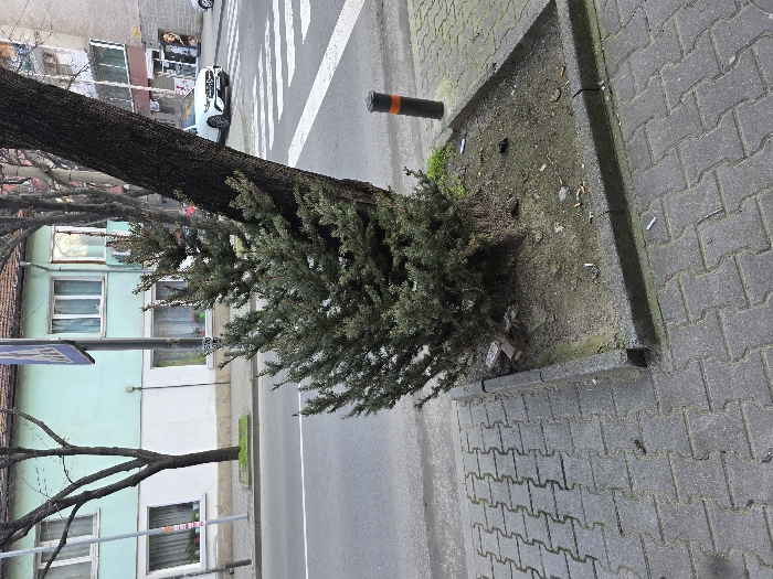 The image displays an urban street scene in Stara Zagora, Bulgaria, captured from a sidewalk vantage point. In the foreground, grey interlocking concrete pavers form the sidewalk, bordered by a rectangular concrete planter. This planter contains loose soil, numerous discarded cigarette butts, a large deciduous tree trunk, and a cluster of smaller, dense evergreen shrubs. A black bollard with an orange top is situated next to the planter on the sidewalk. Beyond the sidewalk and planter lies an asphalt roadway featuring a marked white pedestrian crosswalk. A white Mercedes-Benz SUV is parked on the far side of the road, positioned near the crosswalk. A blue and white rectangular street sign, likely a pedestrian crossing indicator, is mounted on a pole above the street. In the midground and background, multiple buildings line the street. A prominent light blue two-story building with a brown-tiled roof and visible windows is positioned on the opposite side of the road. Adjacent structures include multi-story buildings, some featuring ground-floor businesses. Bare deciduous trees are interspersed along the street on the far side. The sky appears overcast. No individuals are present, and no active interactions or movements are depicted.