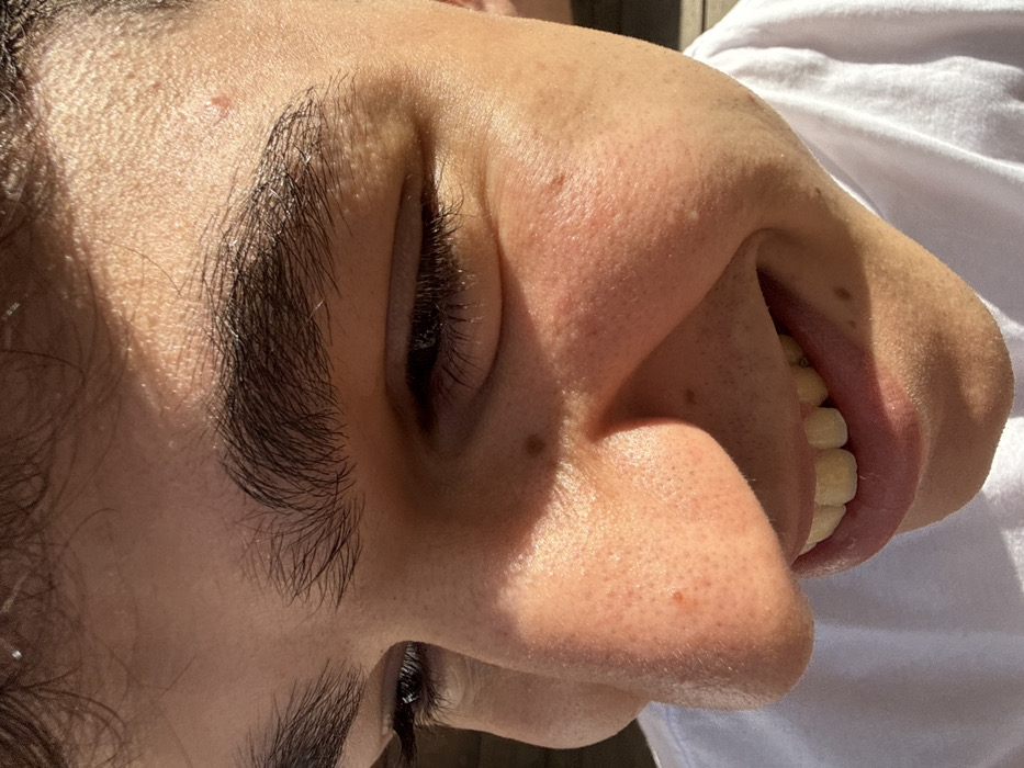 The image is a close-up of a person's face, tilted sideways. Visible features include a thick eyebrow, a closed eye with long lashes, a prominent nose with visible pores and freckles, and a partially open mouth revealing teeth. Part of a white shirt is seen on the right side of the frame. The skin appears to be slightly tanned. Lighting creates highlights and shadows on the face, emphasizing its texture.