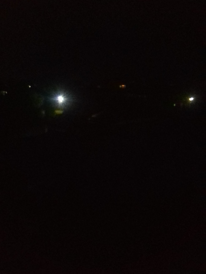 This is an extremely dark, high-angle, night-time photograph captured in Nakuru, Kenya. The scene is dominated by profound blackness, obscuring any discernible foreground or midground details, including people, objects, or environmental features. Four distinct artificial light sources are visible in the distance: a prominent, bright white light with a starburst effect is centered in the upper-left quadrant. To its far left, a dimmer, hazy white light appears. In the upper-right quadrant, a faint, yellowish-orange light is present, with another small, greenish-white light positioned further to the right. The presence of these distant lights suggests urban or semi-urban infrastructure and human activity within the otherwise pitch-black environment.