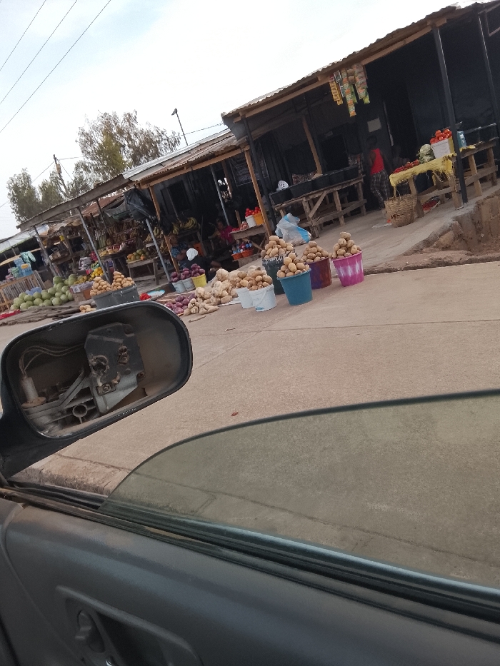 The image displays an outdoor market scene in Jos, Nigeria, viewed from inside a vehicle. In the immediate foreground on the left, the internal, dust-covered mechanical components of a vehicle's missing side mirror are prominently visible, accompanied by a section of a dark gray car door and a partially lowered, tinted window. The midground features a paved surface on which multiple colorful plastic buckets (white, blue, purple, pink) are filled with potatoes, stacked in conical piles. Adjacent to these, various root vegetables, including yams, are arranged in heaps on the ground. A row of market stalls lines the street, constructed with wooden frames and corrugated metal roofs, many featuring dark walls. Produce such as large green melons, other fruits, and vegetables are displayed on the ground and on simple wooden tables within these stalls. At least two individuals are present: one person wearing a red top stands near a stall displaying tomatoes, and another person is seated inside a separate stall. The background shows additional market structures and sparse trees under a light, overcast sky.