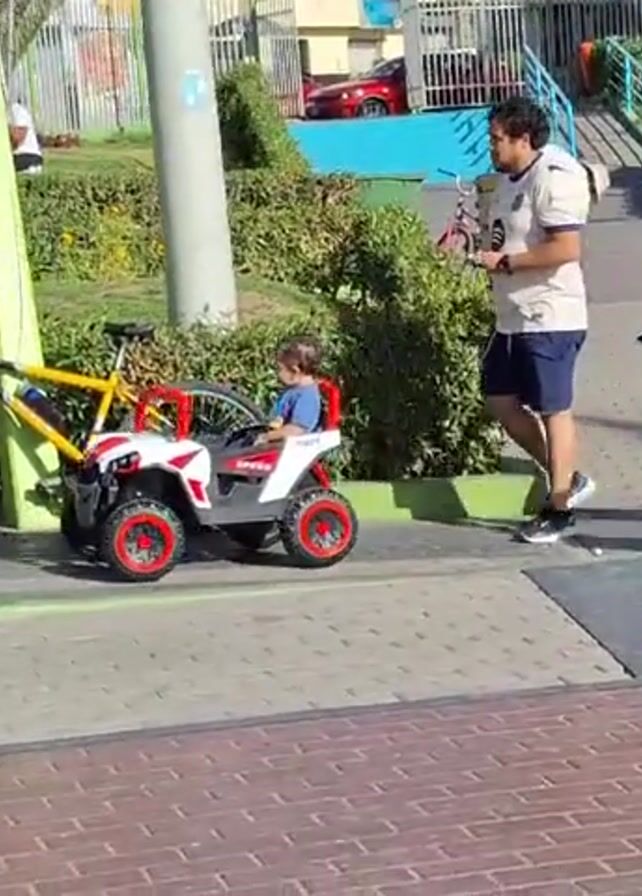 small child in a white and red electric car, likely a toy, with "SPEED" written on the front. The child, wearing a blue shirt, is seated in the car. The car is parked on a paved path next to a green section of ground with benches and plants. Two bicycles are parked near the car. A man in a red and black plaid shirt, wearing a baseball cap, is sitting on one of the benches. A man in a white shirt and blue shorts and a woman in a black top and black sweatpants walk past the car. Other people can be seen on benches and in the background. The video appears to be taken in a park or public space.