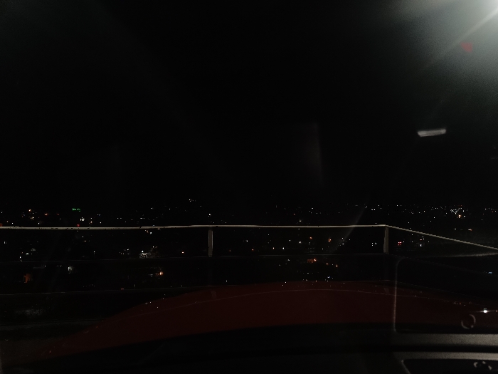 The image displays a nocturnal cityscape of Asenovgrad, Bulgaria, captured from an elevated vantage point. The lower foreground shows a red automotive interior surface, consistent with a dashboard or hood reflection within a vehicle. A prominent, light-toned horizontal railing, indicative of metal construction, spans the mid-ground, serving as a visual divider between the vehicle's interior and the distant urban environment. Beyond the railing, thousands of artificial lights, predominantly white and yellow, illuminate the dark terrain of Asenovgrad, suggesting the presence of buildings and infrastructure distributed across a hilly or undulating landscape. Isolated green lights are also visible among the city's illumination. The upper portion of the frame shows a uniformly dark sky, devoid of celestial bodies. Reflections, including a bright light source, are visible on the viewing surface (likely a windshield). No persons or explicit actions are observable within the frame.