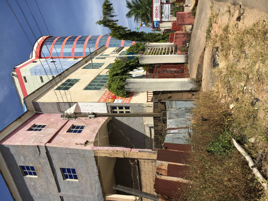 The image depicts an urban scene in Jos, Plateau State, Nigeria, likely along Murtala Mohammed Way, characterized by a mix of aged and modern architecture under a clear blue sky