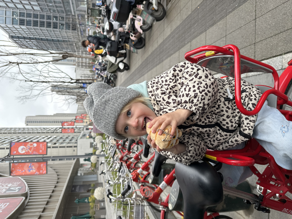 A young Caucasian child, approximately 3-5 years old, with blonde hair and blue eyes, is seated in a red child's seat attached to a red shared bicycle. The child wears a grey knit beanie, a light blue hoodie, a black and white leopard print jacket, and light blue jeans. The child holds a small, brown, bun-shaped plush toy with a metal chain, appearing to bite it with an open mouth and an excited facial expression. The scene is an urban street in Xihu District, China. Behind the child, a long line of identical red shared bicycles is parked on a grey tiled sidewalk. To the left, a modern building with a light-colored facade is visible, featuring lampposts adorned with red banners displaying Chinese characters and the alphanumeric "L4." To the right, further down the sidewalk, several electric scooters and motorbikes are parked, with an adult figure wearing an orange hat visible in the background. Tall, multi-story modern buildings, some with reflective glass, define the urban skyline, interspersed with bare deciduous trees. The sky is overcast.