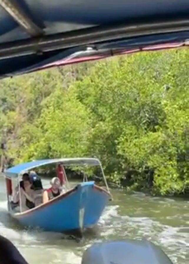boat ride through a river channel lined with dense green vegetation on both sides. Another small boat with several people inside is seen passing in the opposite direction at the beginning of the video. The water is choppy, creating white foam as the boat moves forward. The sky is blue, indicating a sunny day. The river channel leads between two hills covered with trees. The perspective is from inside a boat, likely from a passenger's point of view.